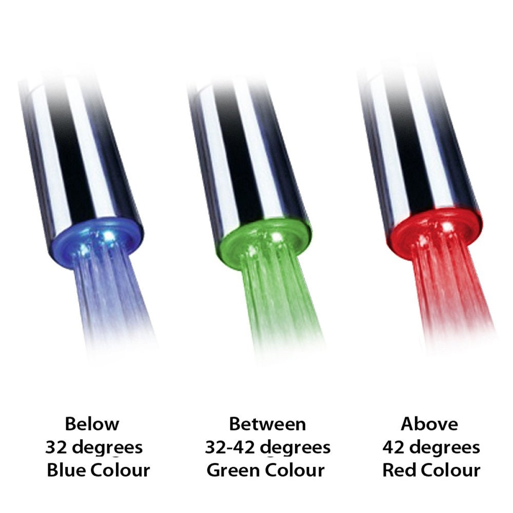 - Temperature-sensitive LED indicators change colour based on water temperature: